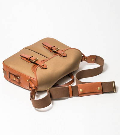 コットン生地にフルタンニンレザーと言うナチュラルな素材同士の組み合わせで、いっそうの高級感と風格を漂わせている。それは生地だ。コットンなのに光沢があり手触りはなめらか、しっかりとした張りと同時にしなやかさもある。もちろん水に強くて、耐久性も抜群である。この生地を作ろうと企画した私たちの夢をかなえてくれた織り職人の技術の合わせ技である。この技術も受け継ぐ人がいないのが残念で仕方ない。